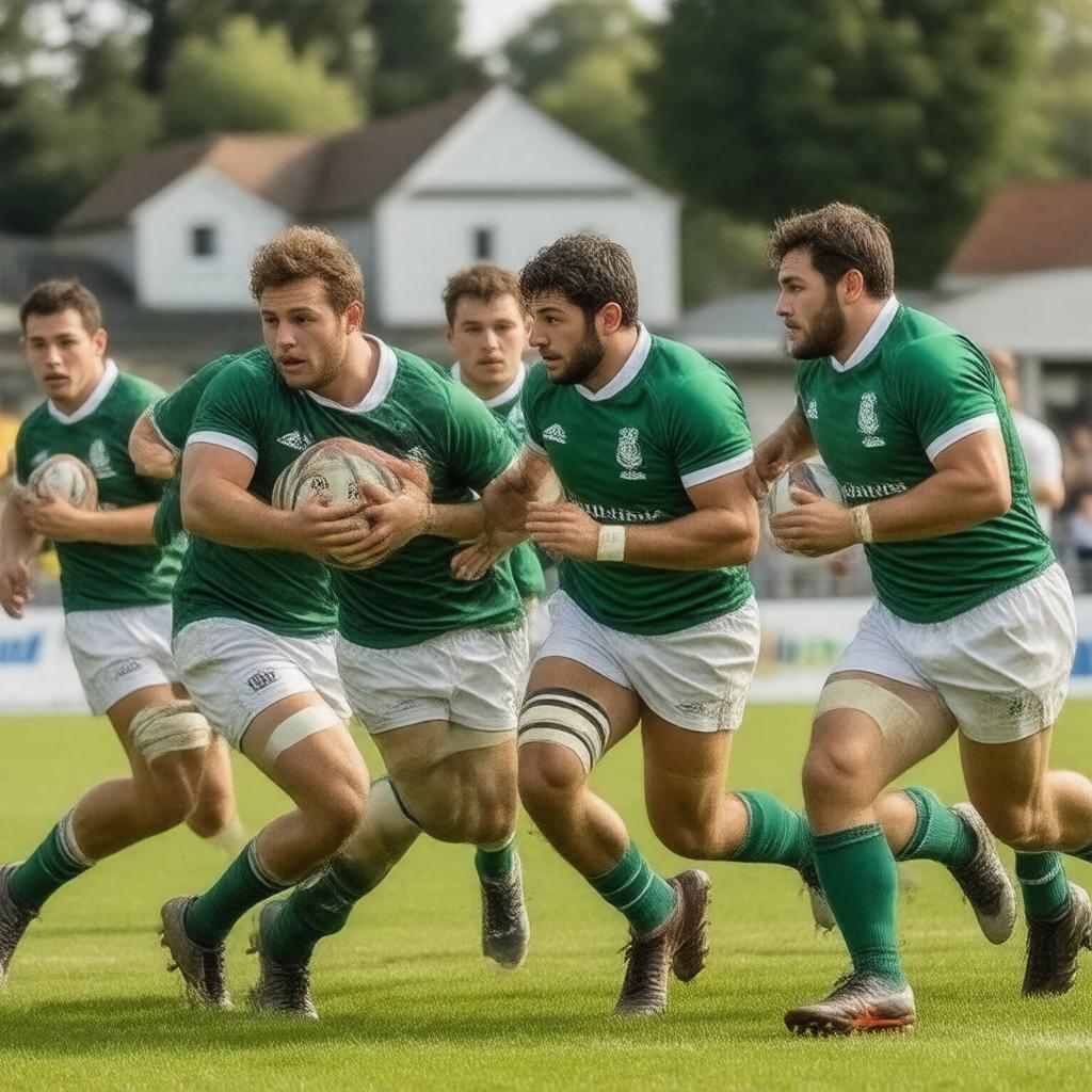 "Generate an image of a rugby team in action, specifically Section Paloise, a French rugby union team based in Pau, Nouvelle-Aquitaine, playing in the Top 14 league, wearing green and white jerseys, with the Stade du Hameau in the background, in a realistic sports illustration style."