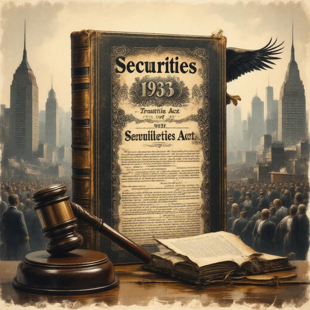 "Create an image of a vintage-style document or a historic law book cover representing the Securities Act of 1933, also known as the 'Truth in Securities Act' or the 'Federal Securities Act', with a backdrop of the Great Depression era New York City or a stock market scene, incorporating elements that signify regulation, disclosure, and protection, such as a gavel, a shield, or an American eagle, in a formal and professional style."