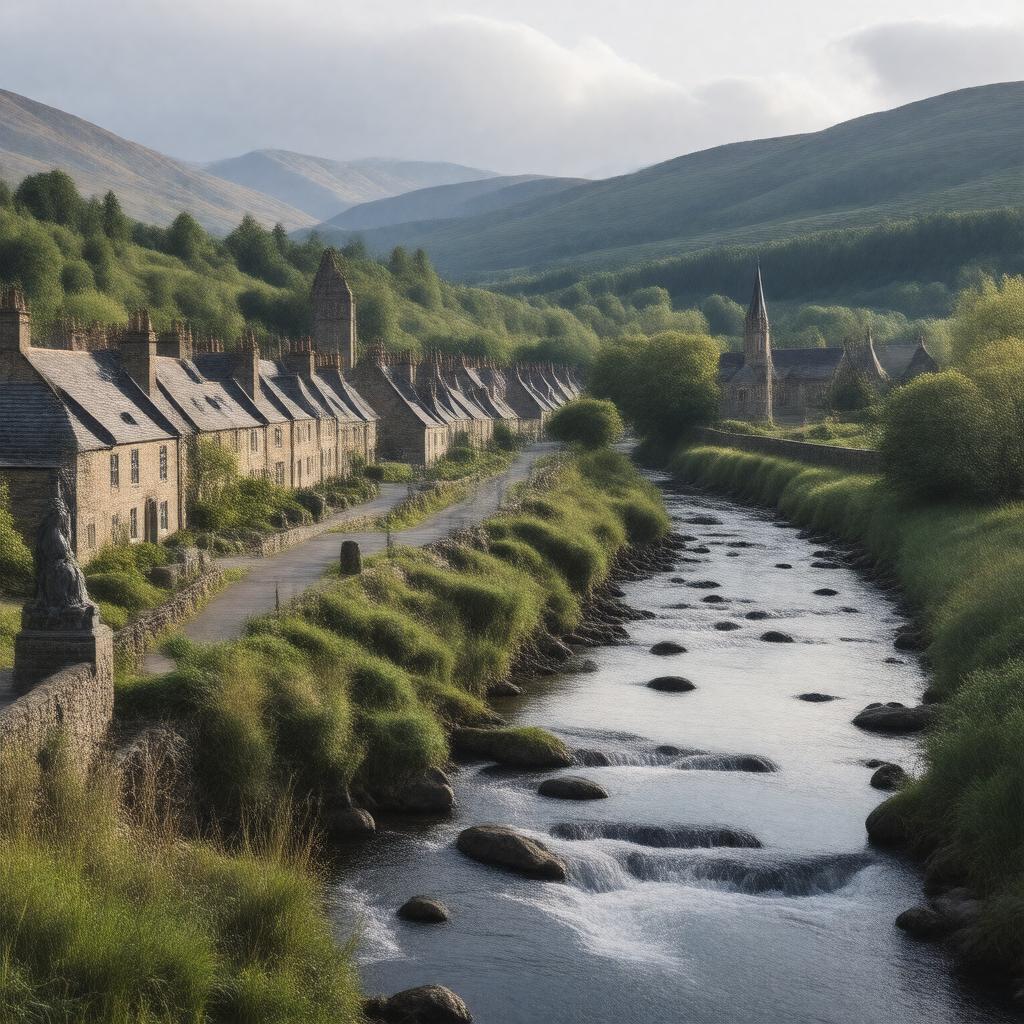 "Generate a realistic image of a charming town in the Scottish Borders, with a river (Ettrick Water) flowing through it, surrounded by rolling hills and countryside. The town should have a historic feel, with old buildings, a town square (Selkirk Market Place) and a church (Selkirk Parish Church). In the distance, a monument or statue of a notable person (Sir Walter Scott) can be seen. The image should evoke a sense of community and tradition, highlighting the town's famous events (Selkirk Common Riding) and local specialties (Selkirk Bannock). The style should be reminiscent of a watercolor painting or a photograph with a warm, golden light, capturing the essence of rural Scotland."