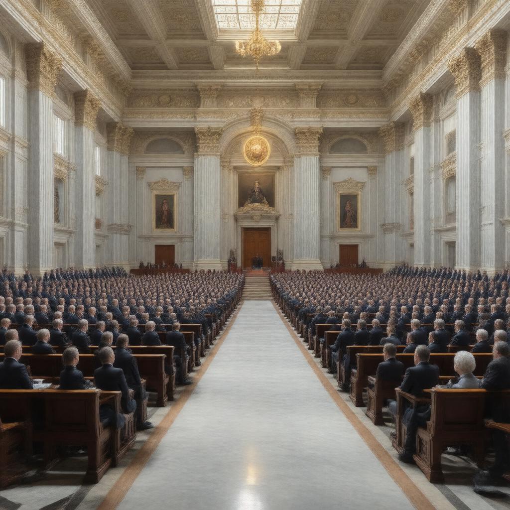 "Generate a realistic image of the Senate of Chile, specifically the interior of the National Congress Building in Valparaíso, with the 50 members seated in a formal setting, representing the legislative body of Chile, with a hint of the Coat of arms of Chile and a classic, institutional style, reflecting its establishment in 1812 and its role as part of the National Congress of Chile."