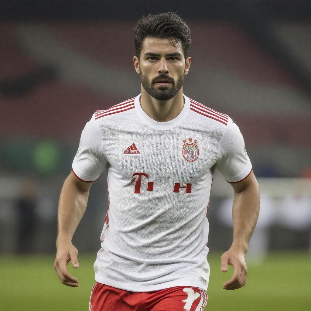 Generate a realistic image of Serdar Tasci, a German footballer of Turkish descent, in his football kit, specifically in the centre-back position, with a serious and focused expression, possibly in action on the field, wearing VfB Stuttgart, FC Bayern Munich, Spartak Moscow, or İstanbul Başakşehir F.K. jersey, highlighting his athletic build and 1.86 m height, in a style suitable for a sports portrait.