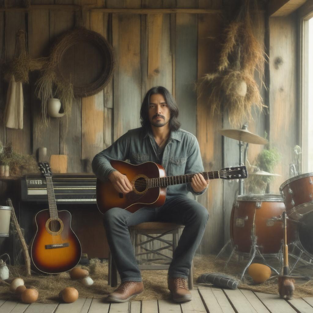 Generate an image of Seth Avett, a musician and singer-songwriter, in a rustic, earthy setting, surrounded by instruments such as guitar, piano, and drums, with a warm and intimate lighting, in a folk-inspired style, capturing his soulful and emotive persona, with the color palette reflecting the natural and earthy tones of his music genre, specifically folk rock, indie folk, and bluegrass.