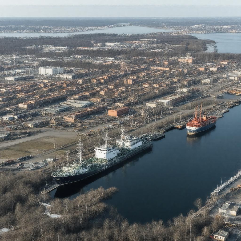"Generate a realistic image of Severodvinsk, a city located on the White Sea in Arkhangelsk Oblast, Russia, showcasing its shipbuilding industry and harbor, with Sevmash and Zvezdochka shipyard in the background, under a subarctic climate, with a elevation of 10m, at a latitude of 64.5631 and longitude of 39.8303."