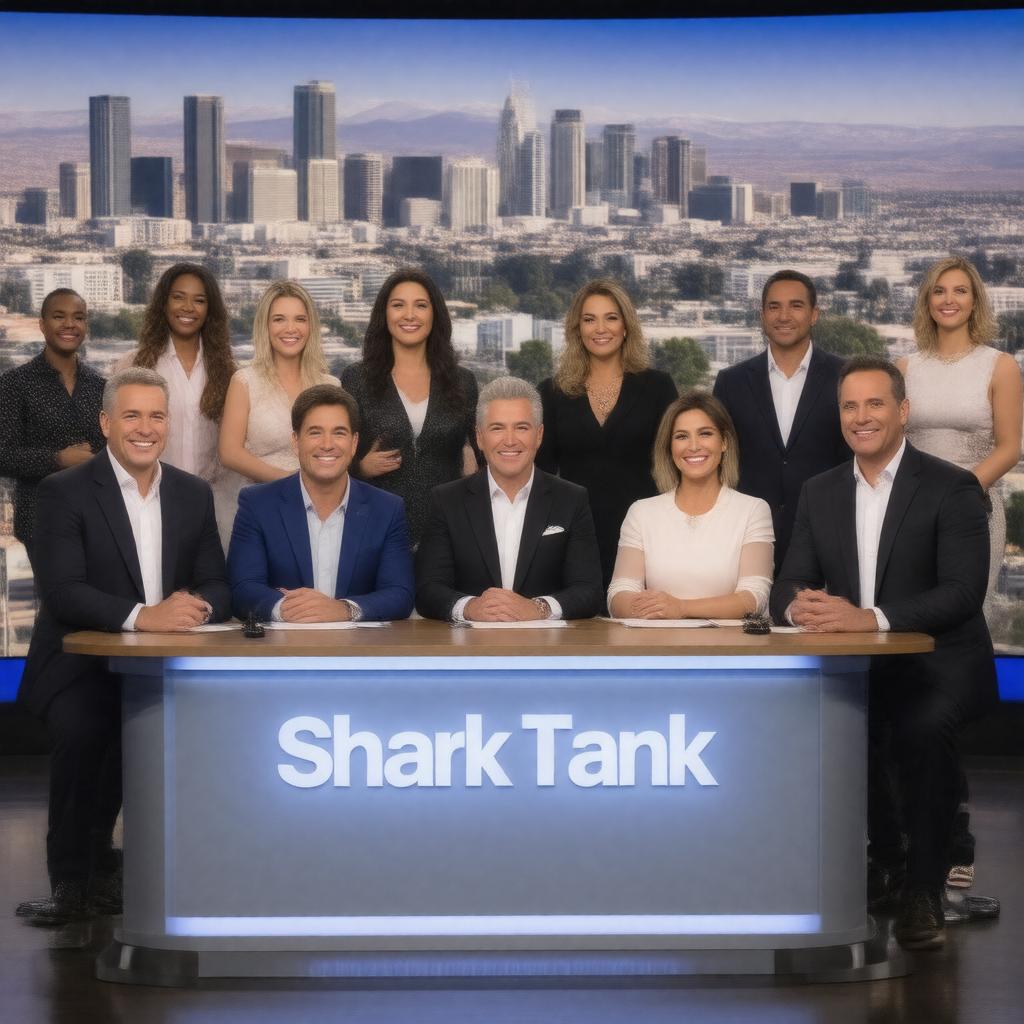 "Generate an image of the Shark Tank set with the investors' panel, featuring Mark Cuban, Barbara Corcoran, Lori Greiner, Robert Herjavec, Daymond John, and Kevin O'Leary, sitting at a table with a cityscape of Los Angeles, California in the background, with a group of entrepreneurs standing confidently in front of them, ready to pitch their business ideas, in a realistic and dynamic style, capturing the excitement and tension of the show."
