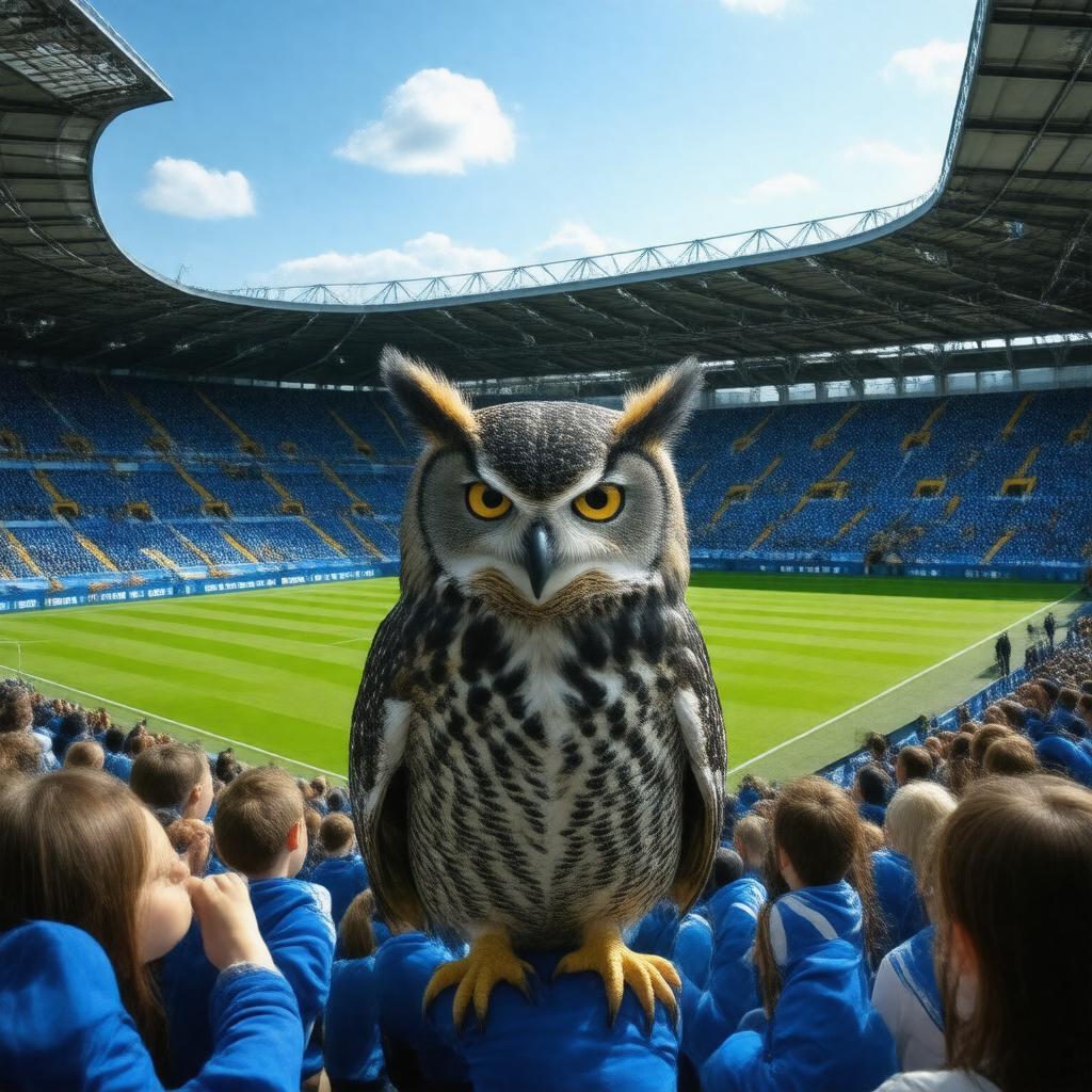 "Generate an image of a football stadium with a prominent owl mascot in the foreground, surrounded by a sea of blue and white-clad fans, with the Hillsborough Stadium's iconic structure in the background, under a bright English sky, representing Sheffield Wednesday Football Club."
