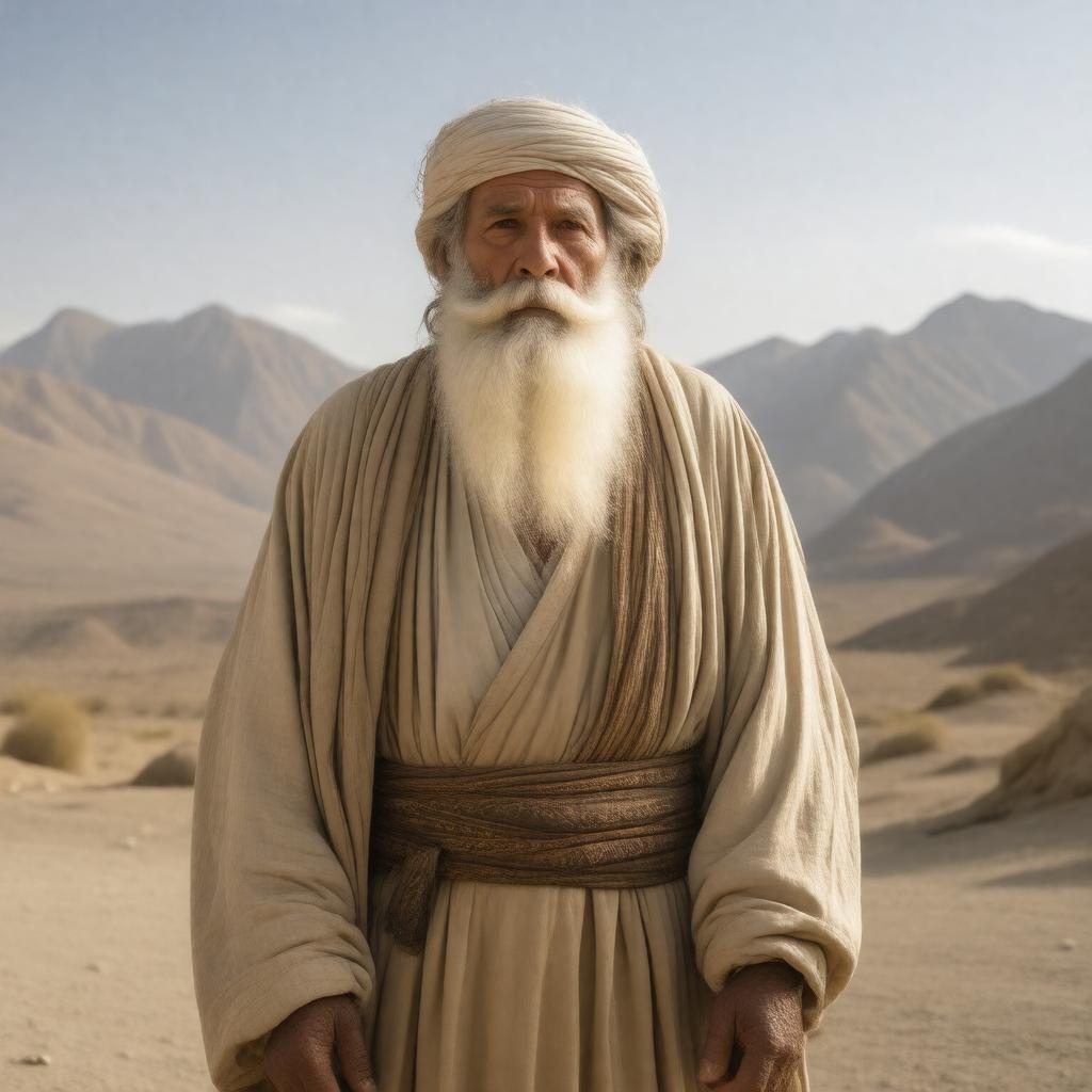 Generate an image of Shem, a biblical figure and one of the sons of Noah, depicted as an elderly man with a long white beard, dressed in a simple, ancient Middle Eastern-style robe, standing in a desert landscape with a subtle background of mountains, conveying a sense of wisdom and heritage, in a realistic and classical style reminiscent of traditional biblical illustrations.