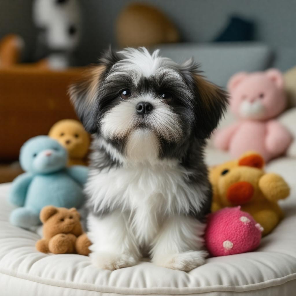"Generate an image of a Shih Tzu, a small, friendly dog with a distinctive pushed-in face and a luxurious double coat, sitting on a plush cushion, surrounded by toys and with a gentle expression, in a warm and cozy indoor setting, with a realistic style and attention to detail, incorporating the breed's characteristic features, such as a long, silky fur in various colors, and a compact body, weighing between 4-7.2 kg and standing between 20-28 cm tall."