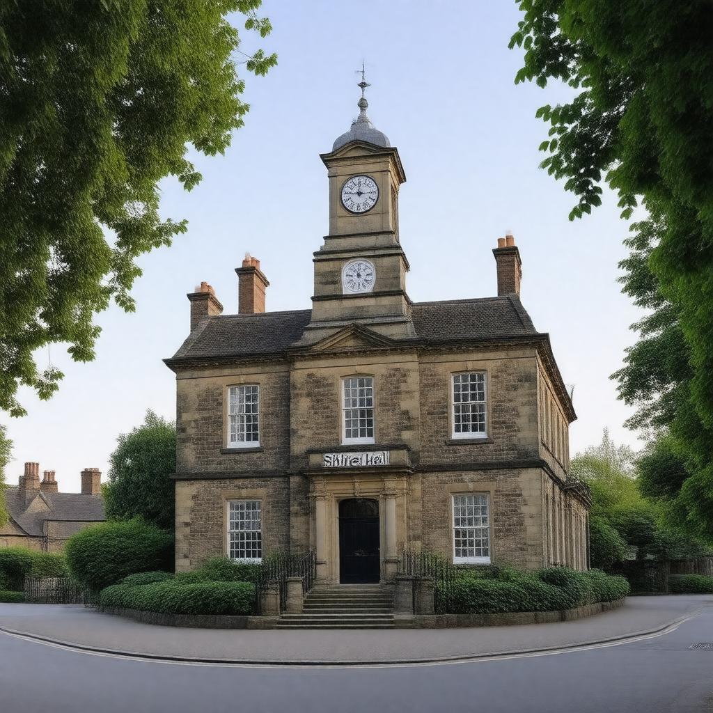 Generate an image of a traditional British building with a clock tower, situated in a small town or city, surrounded by lush greenery and possibly a town square, representing Shire Hall, a type of building used for public administration and court proceedings, in a realistic architectural style reminiscent of 18th or 19th century England.