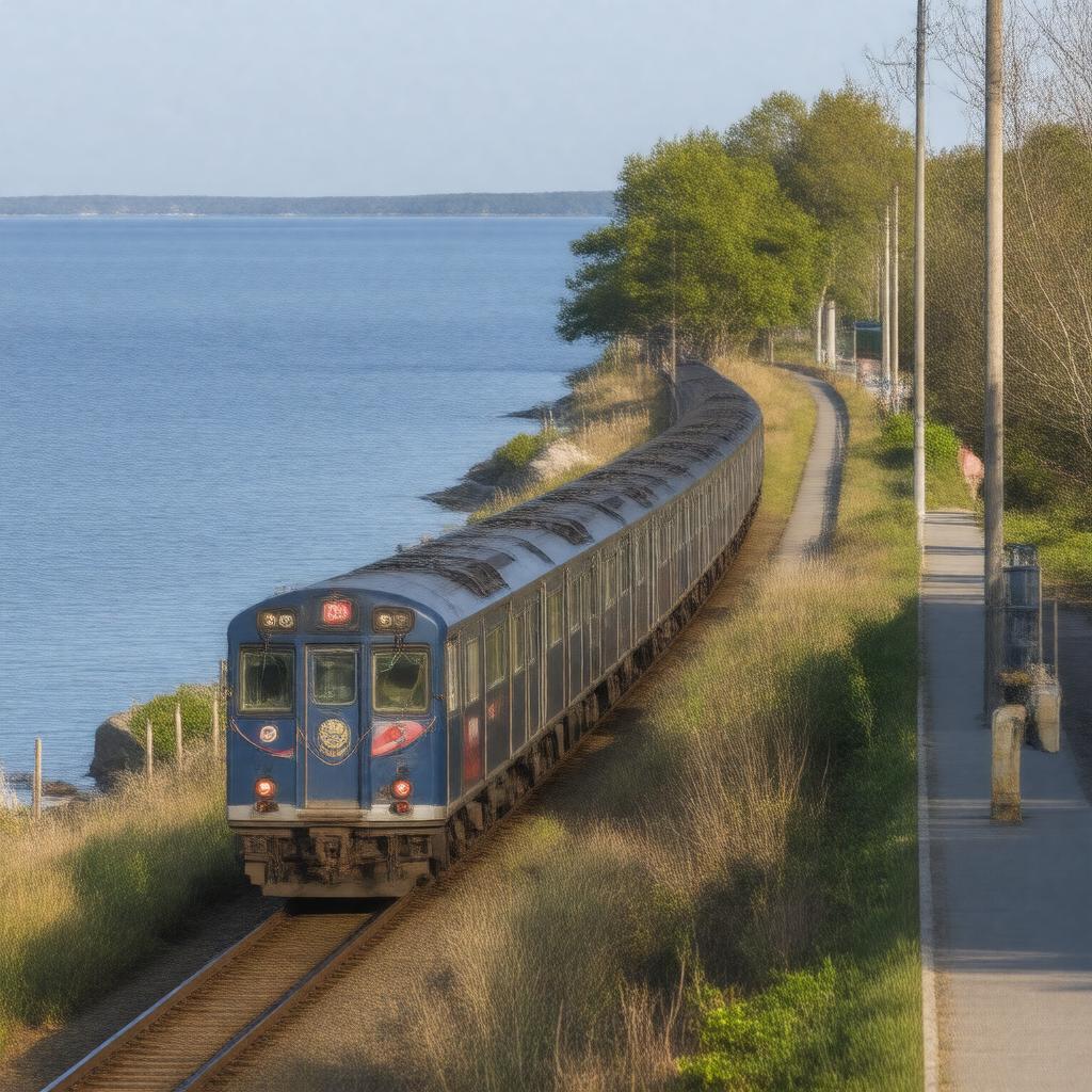 "Generate an image of a Shore Line East commuter rail train traveling along the Connecticut coastline, with a scenic view of the Long Island Sound in the background. The train, consisting of Mafersa coaches and a GE P40DC locomotive, is passing by a picturesque station, such as Old Saybrook or Branford, with passengers boarding or exiting the train. The image should capture the essence of a weekday peak or off-peak service, with a mix of commuters and possibly some tourists. Incorporate the Shore Line East logo, with its distinctive blue and red colors, and a subtle hint of the Northeast Corridor track in the background. The style should be realistic, with attention to detail on the train, station, and surrounding landscape."