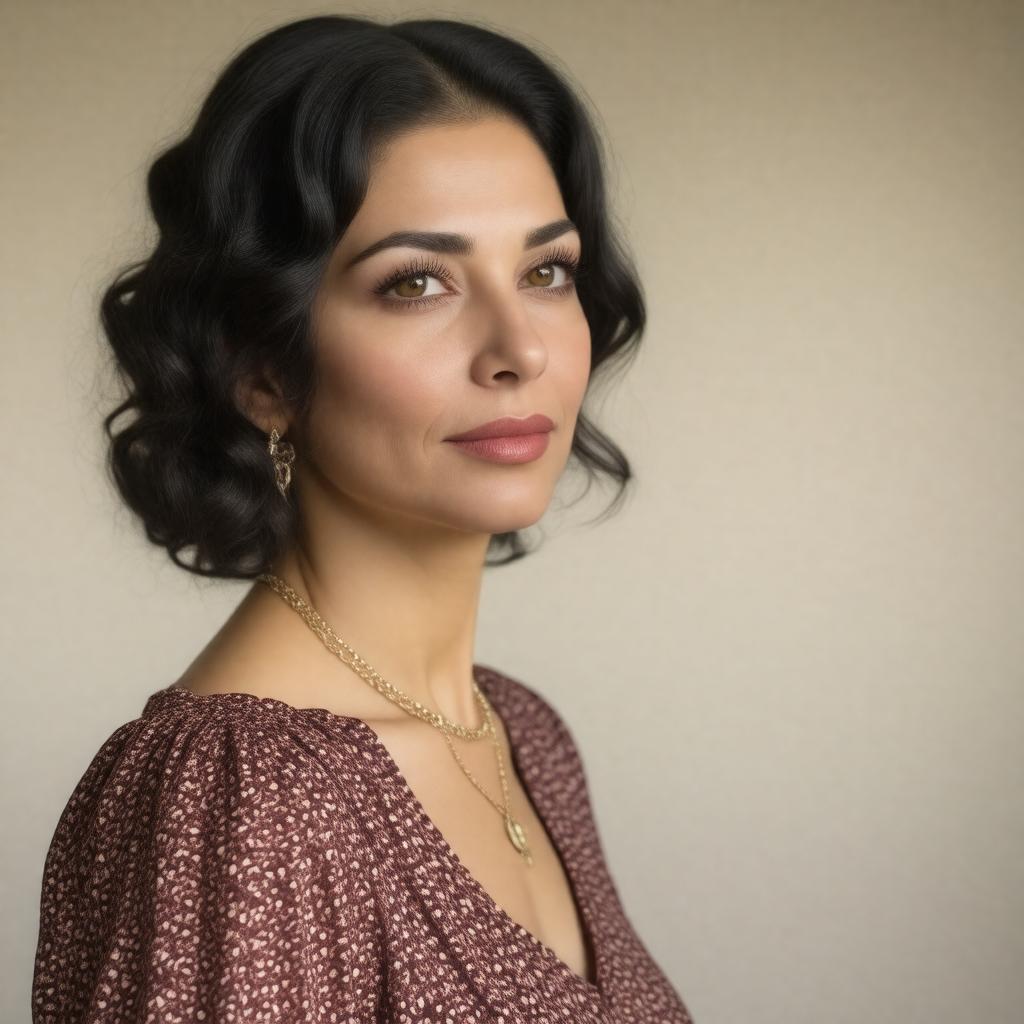 Create a realistic portrait image of Shoshana Damari, the "Queen of Hebrew Music", a renowned Israeli singer and actress, in a warm and elegant style, possibly in a studio setting with a subtle background that hints at her Mizrahi music heritage, dressed in attire befitting her era and profession, with a gentle, captivating expression that reflects her legacy and contributions to Israeli music and culture.
