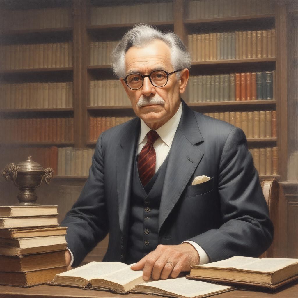 Create an image of Sidney Hook, a middle-aged American philosopher, author, and professor, standing in a library or study with books and papers around him, wearing a suit and glasses, with a thoughtful expression, in a realistic style.