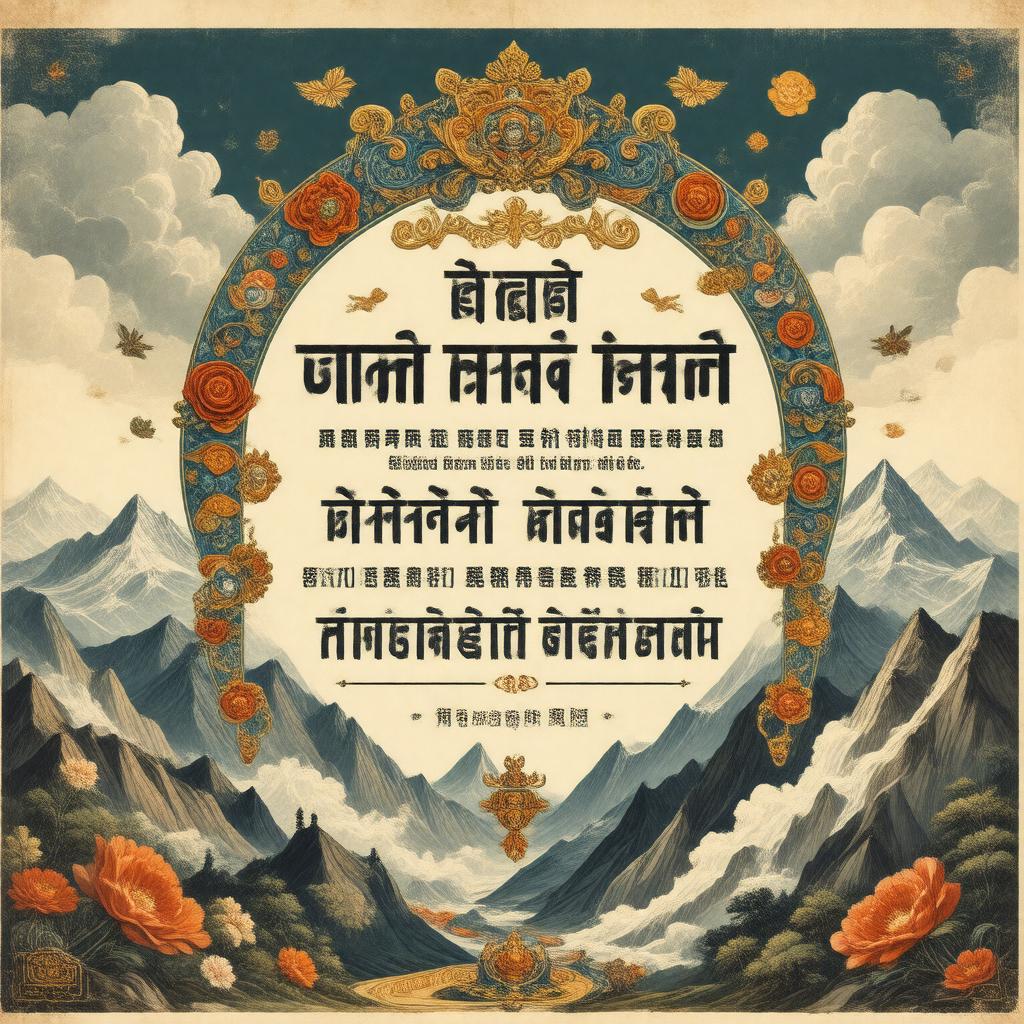 Generate an image of a vibrant, colorful illustration of the Sikkimese language, represented by a stylized, hand-written script in the Tibetan alphabet, surrounded by traditional Sikkimese motifs and patterns, set against a backdrop of the Eastern Himalayan mountains, with a subtle texture resembling the pages of an ancient manuscript, symbolizing the language's rich cultural heritage and its vulnerable yet resilient presence in the region.