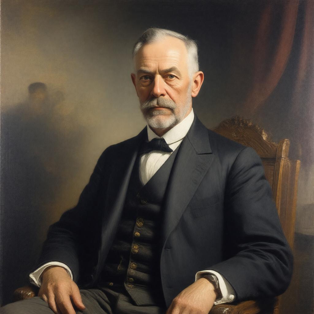 "Generate a realistic portrait of Sir Alfred Milner, 1st Viscount Milner, a British colonial administrator, civil servant, and politician, in a formal attire, sitting in a dignified pose, with a background that reflects his association with the British Empire, in the style of a Victorian-era oil painting."