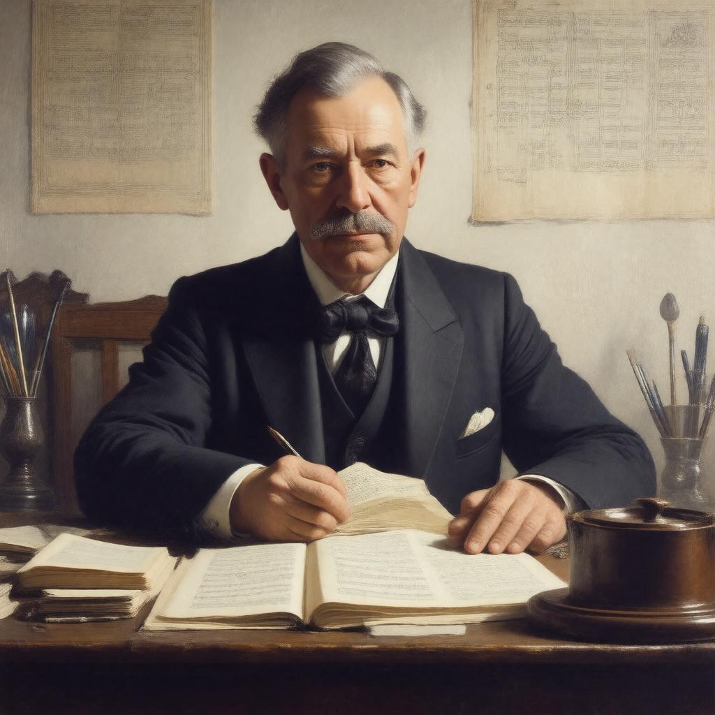 Generate an image of a middle-aged British man in formal attire, likely from the early 20th century, sitting at a desk with a musical composition in front of him, surrounded by symbols of classical music, with a subtle background hinting at his London roots and connection to prestigious music institutions; the style should be a realistic portrait with classical undertones, reflecting his occupation as a renowned composer and conductor.