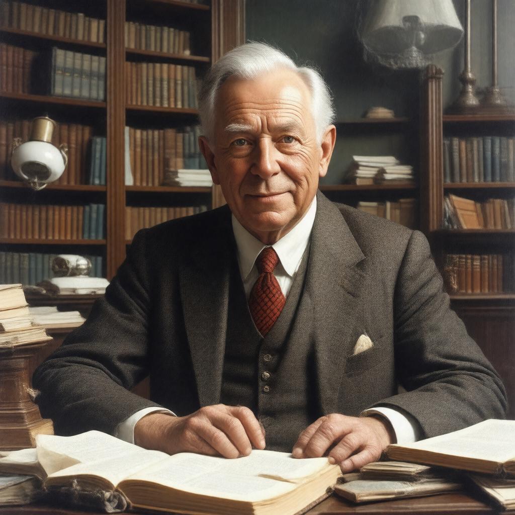 Generate an image of a British historian in his later years, sitting in a comfortable study with books and papers scattered around him, with a warm and authoritative expression. He is dressed in formal attire, including a suit and tie, with a hint of a military background. In the background, include subtle hints of his notable works, such as "The Face of Battle" and "The Second World War". The style should be realistic and dignified, reflecting his title as Sir John Keegan, a renowned military historian and author.