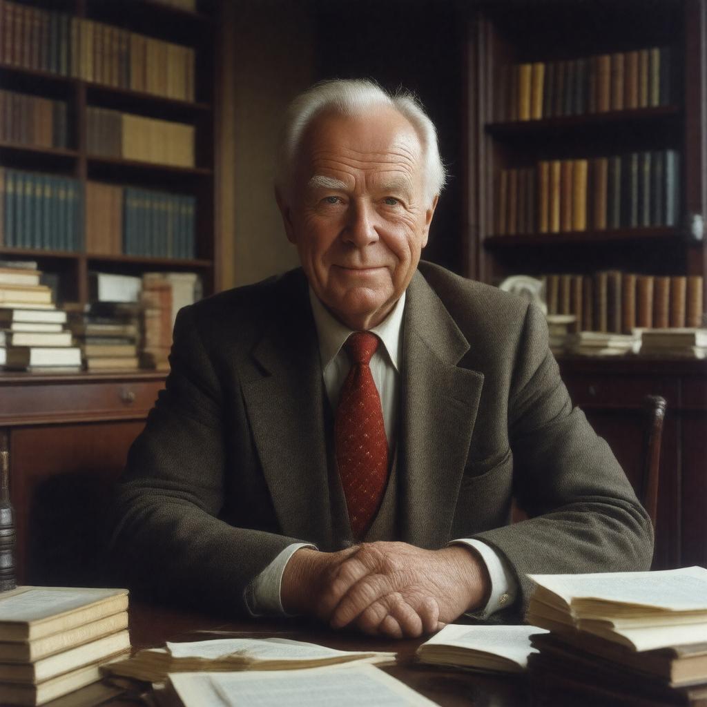 Create an image of a realistic portrait of Sir John Le Carré, a British novelist, in a contemplative pose, sitting in a cozy study with books and papers surrounding him, with a hint of a smile on his face, capturing his essence as a master of spy fiction; style: photorealistic, warm color palette, soft lighting.