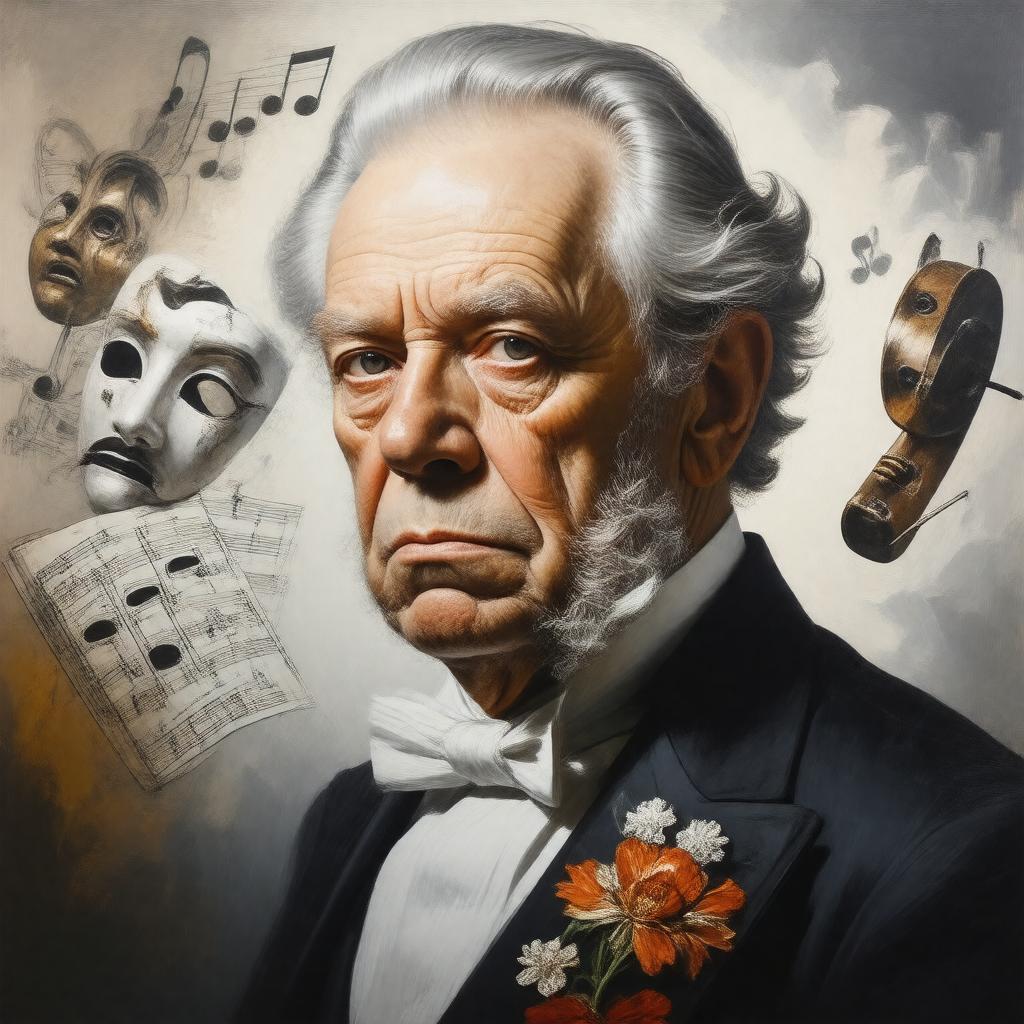"Create a realistic portrait of Sir Thomas Allen, a renowned British opera singer, in a formal setting, reflecting his esteemed career and contributions to the world of classical music, incorporating elements that signify his achievements, such as opera masks, musical notes, or symbols of his notable roles and awards."