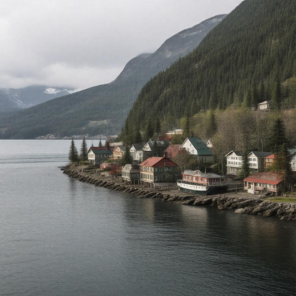 "Generate a realistic image of Skagway, a small city in Alaska, USA, surrounded by mountains and water, with a scenic waterfront and historic buildings, reflecting its rich history in the Klondike Gold Rush, in a style that captures its rugged and natural beauty."