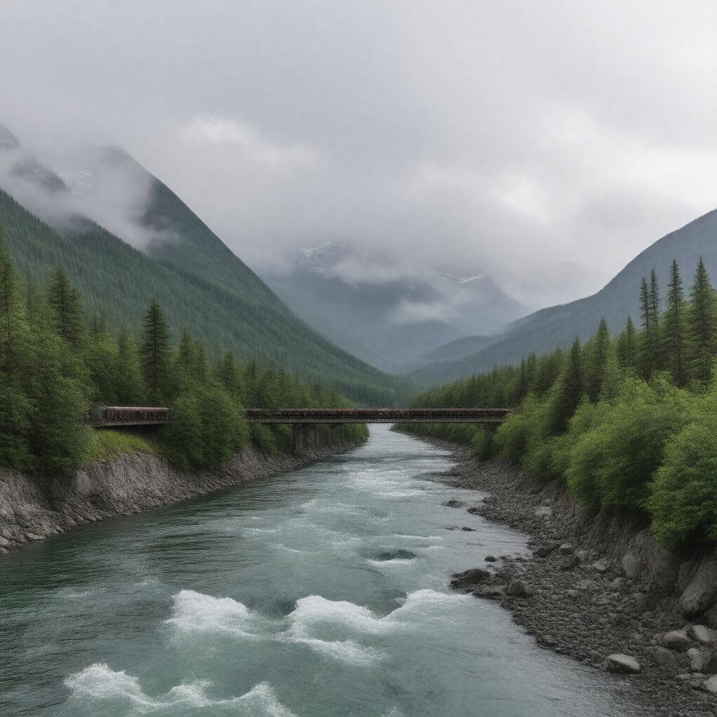 "Generate a serene landscape image of the Skagway River, approximately 20 miles long, flowing through the scenic mountains of Southeast Alaska, with the White Pass and Yukon Route railway crossing over it, surrounded by lush greenery and majestic Coast Mountains in the background, under a misty sky, reflecting the tranquility of the region."
