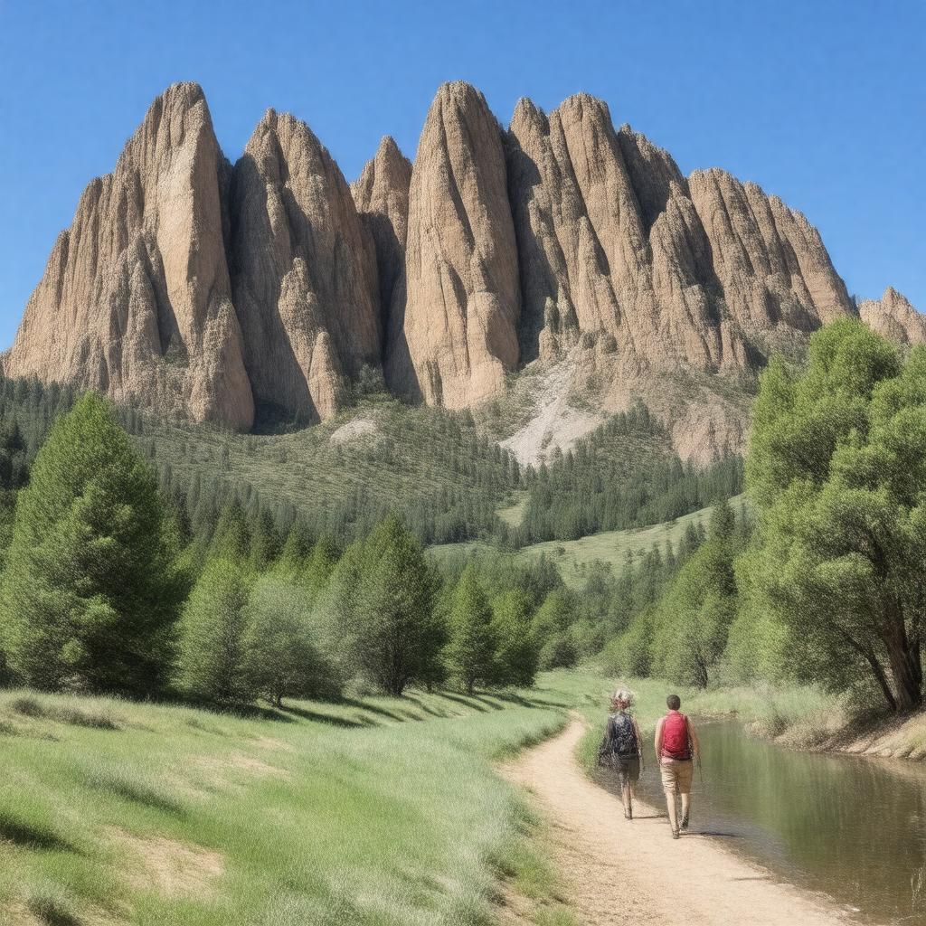 "Generate a photorealistic image of Smith Rock, a prominent geological formation in Oregon, USA, showcasing its distinctive granite spires, including the iconic Monkey Face, The Dihedrals, and The Red Wall, surrounded by the Crooked River and lush greenery, with hikers and climbers in the distance, set against a clear blue sky."