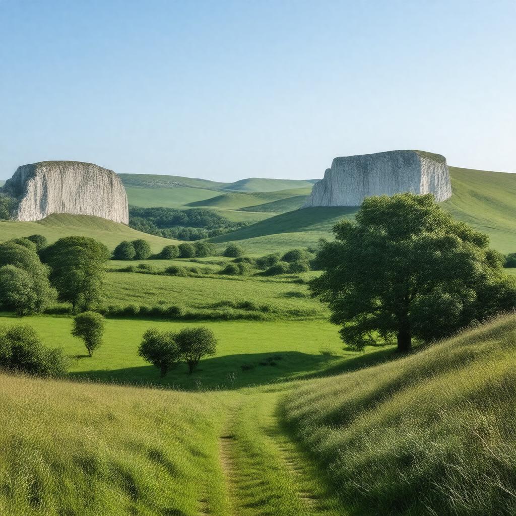 "Generate an image of a serene and picturesque landscape featuring rolling hills, chalk cliffs, and a meandering path, representing the South Downs mountain range in South East England, with a clear blue sky and a few scattered trees, showcasing its scenic beauty and calcareous grassland flora."