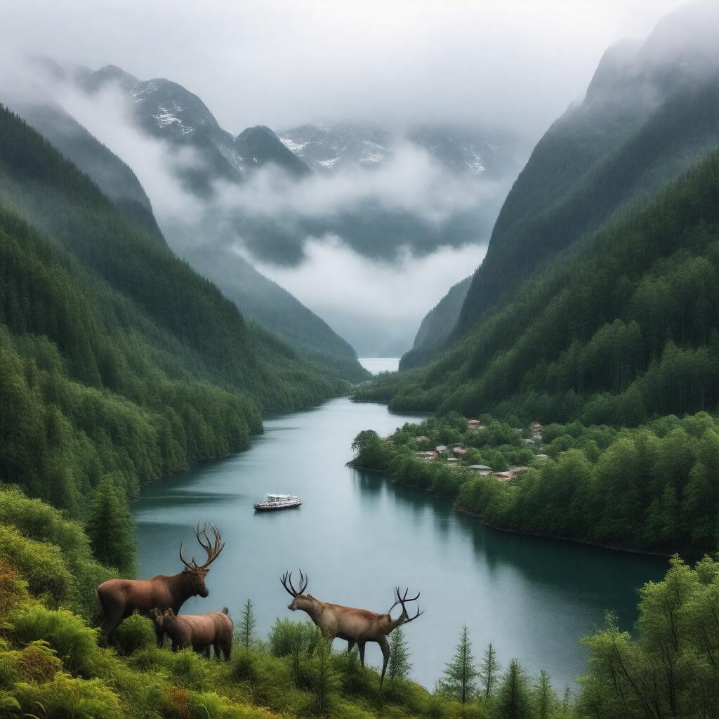 "Generate an image of a misty, rainforest-covered landscape with fjords and mountains, featuring a small town or village in the distance, surrounded by lush greenery and waterways, representing Southeast Alaska, with elements such as a floatplane or ferry in the scene, and wildlife like deer, moose, or black bears roaming in the area, under a cloudy, tropical rainforest climate sky."