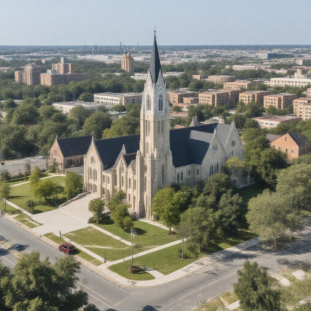 "Generate an image of a large, conservative Protestant church building with a steeple, surrounded by a sprawling campus with multiple buildings, including a large auditorium and several educational facilities, in a suburban or urban setting in the Southern United States, with a sign reading 'Southern Baptist Convention' or 'SBC' prominently displayed, symbolizing the largest Protestant denomination in the United States, with a backdrop of a cityscape or a rural landscape with a few trees and a clear blue sky."
