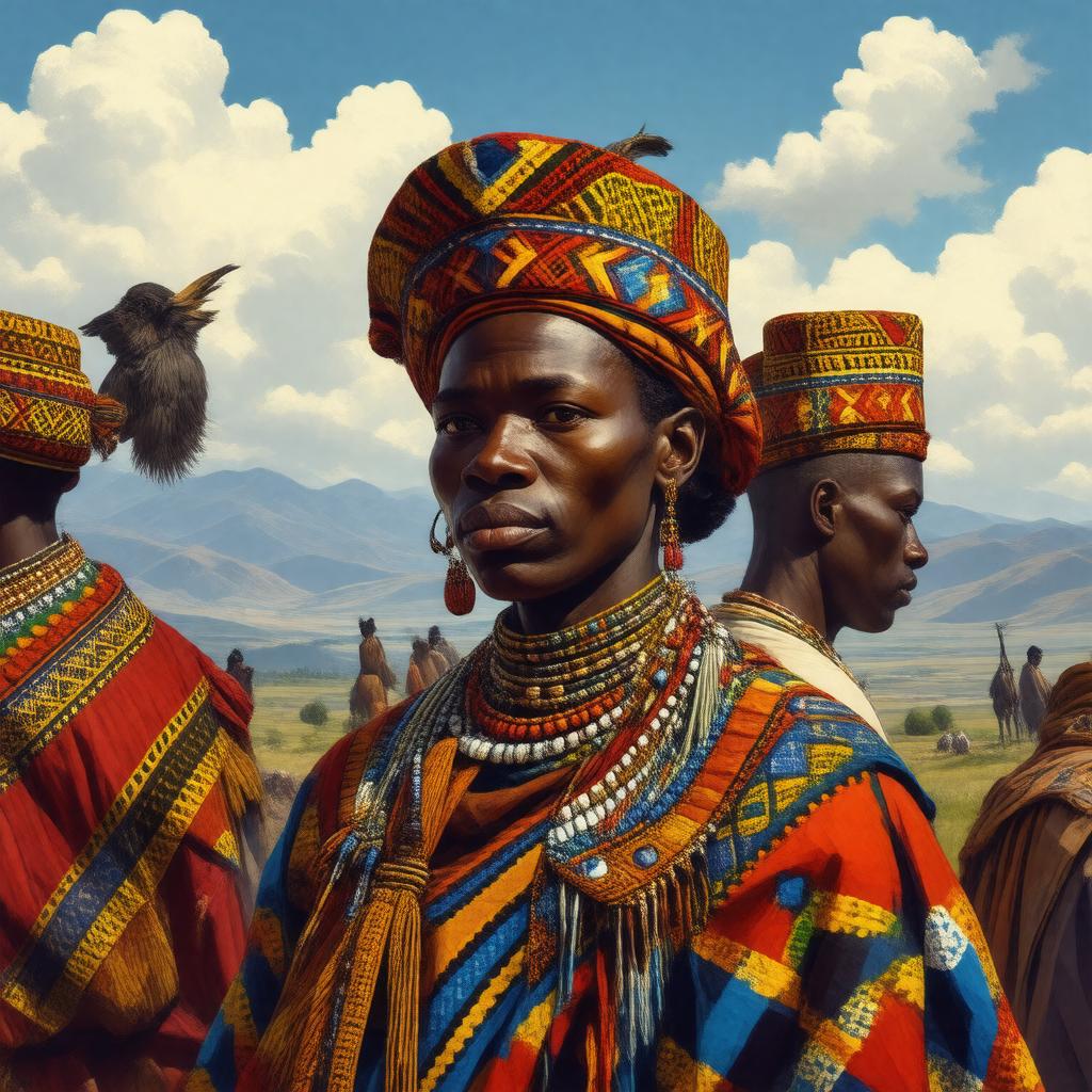 "Generate an image of a vibrant, colorful illustration representing the Southern Sotho language, also known as Sesotho, with traditional Basotho hat and clothing patterns in the background, and a subtle landscape of Lesotho or South African mountains and plateaus, symbolizing the language's cultural heritage and geographical presence."