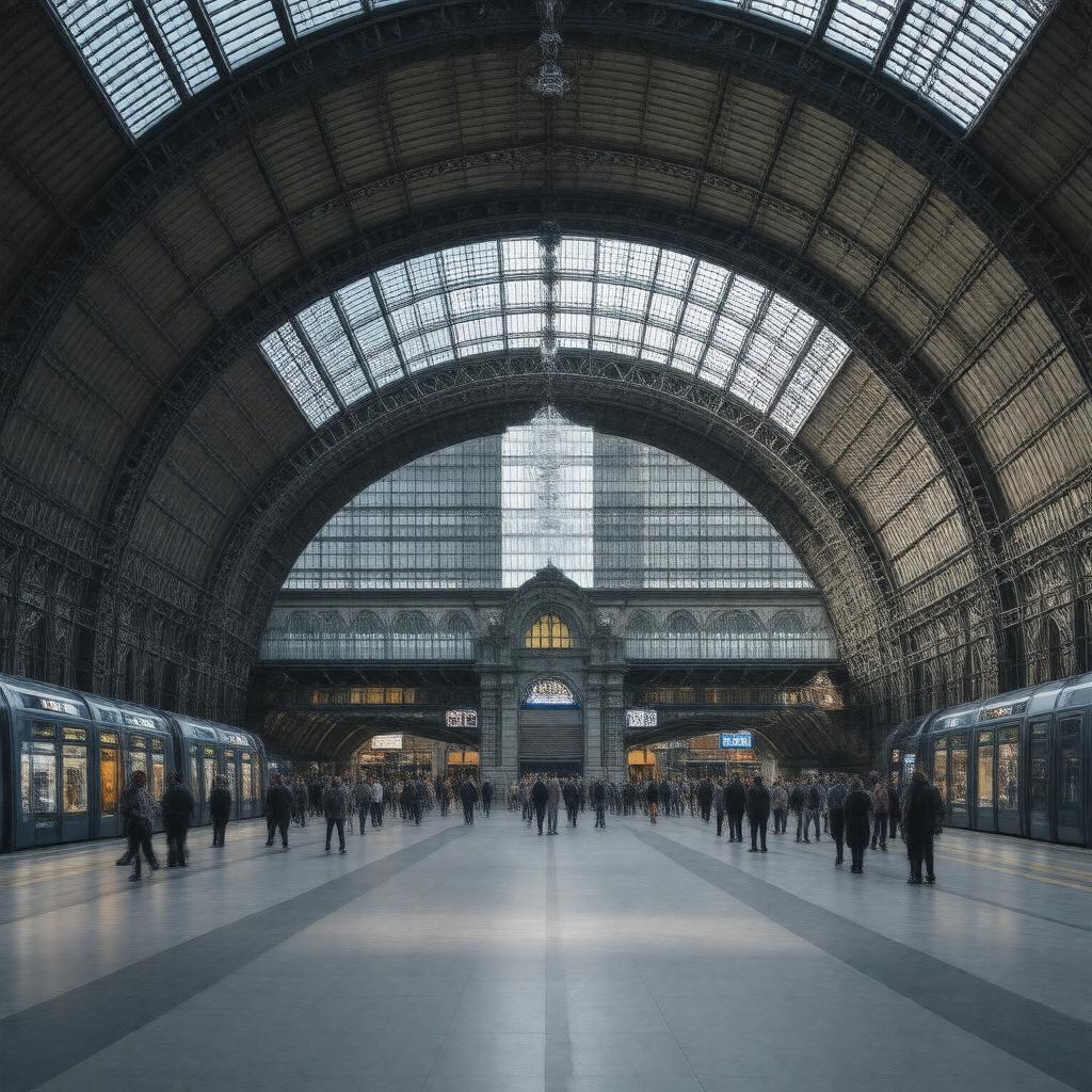 "Generate a realistic image of Southwark station, a modern railway station in London, with its distinctive architecture designed by Richard MacCormac, featuring a large entrance on Blackfriars Road, and surrounded by notable landmarks such as The Cut and Young Vic Theatre, with Jubilee line trains and passengers in the vicinity, under a daytime sky."