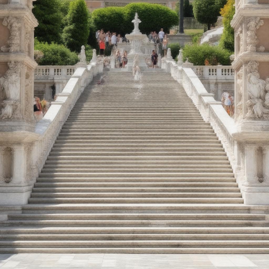 "A grand, sweeping staircase made of travertine stone, with 135 steps, in the heart of Rome, Italy, connecting Piazza di Spagna to Trinità dei Monti, showcasing Baroque style architecture, with a backdrop of lush greenery and a beautiful fountain, Fontana della Barcaccia, in a sunny day, with tourists strolling and taking in the sights, in a realistic and detailed style."