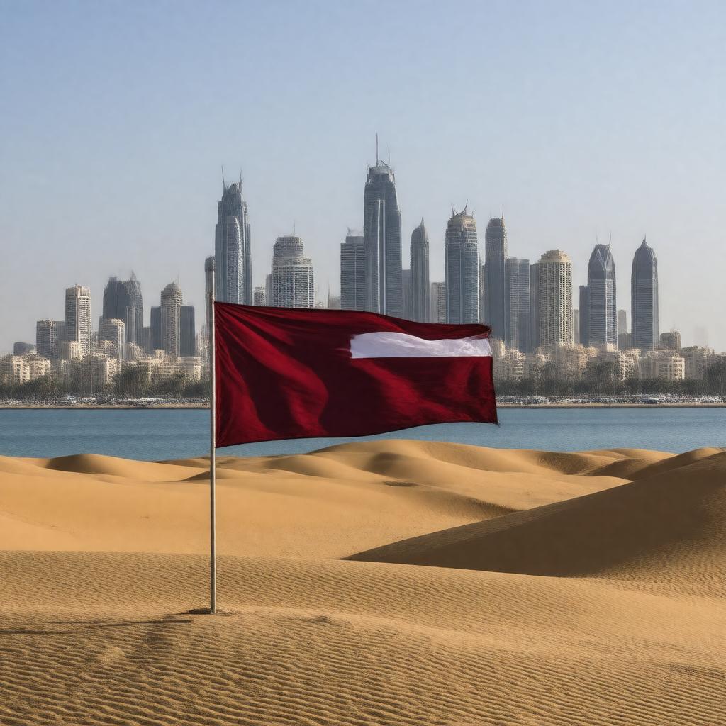 "Generate an image of a majestic desert landscape with a modern cityscape in the background, featuring the iconic skyline of Doha, Qatar's capital city. Include traditional Qatari architecture, such as mosques and souqs, alongside sleek skyscrapers and a bustling port. Incorporate the Qatari flag waving in the foreground, with the maroon and white colors prominent. The image should convey the country's rich history, cultural heritage, and rapid modernization, set against the stunning backdrop of the Arabian Desert and the Persian Gulf."