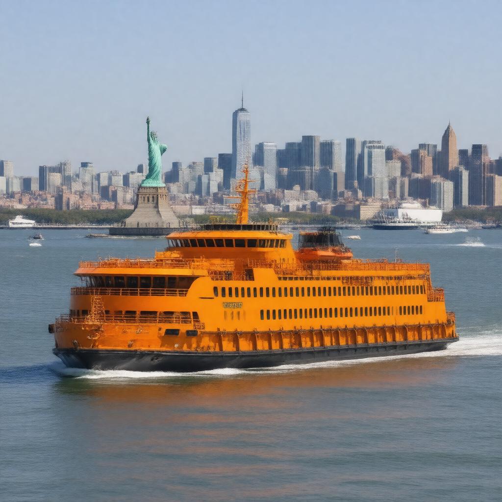 "Generate an image of a large orange ferry boat traveling through New York Harbor, with the Statue of Liberty and Lower Manhattan skyline in the background. The ferry, identified as the Staten Island Ferry, is in the middle of its 5.2-mile journey from Whitehall Terminal in Manhattan to St. George Terminal on Staten Island. The image should capture the ferry's bright orange color and its distinctive profile, with multiple decks and a prominent bow. The scene should be depicted in a realistic style, with a daytime setting and a clear view of the surrounding harbor and cityscape."