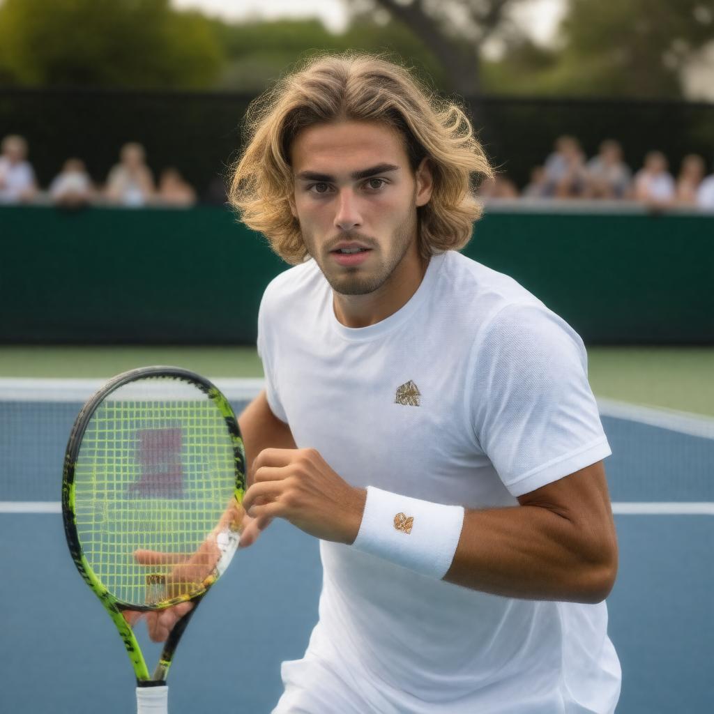 "Create a realistic portrait of Stefanos Tsitsipas, a Greek professional tennis player, in action on the court. He should be depicted with a determined expression, wearing a sleek tennis outfit and holding a tennis racket. His blond hair and brown eyes should be visible, and his signature one-handed backhand pose should be captured. The background should be a blurred tennis court with a subtle crowd in the stands. The style should be photorealistic with a slight warm tone to reflect his Greek heritage."