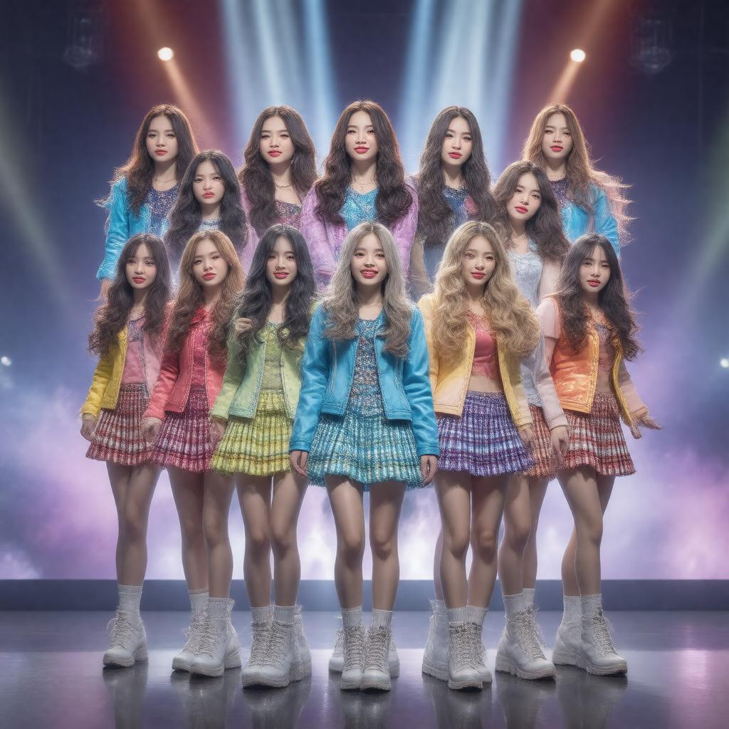 "Generate an image of a vibrant and lively J-pop girl group performance, featuring 16 members standing in a harmonious formation, dressed in stylish and colorful outfits, with a dynamic background that reflects their energetic music, representing Step Sings, a Japanese musical group formed under Lantis label, active since 2023."