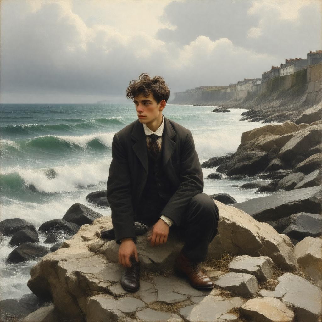 "Generate an image of Stephen Dedalus, a young Irish male, dressed in early 20th-century attire, sitting on a rocky shoreline, lost in thought, with a backdrop of Dublin's coastline, symbolizing his struggle with his artistic identity and his famous quote 'History is a nightmare from which I am trying to awake.' Incorporate elements of modernism and stream-of-consciousness literary styles. Style: early 20th-century literary realism with a hint of expressionism."
