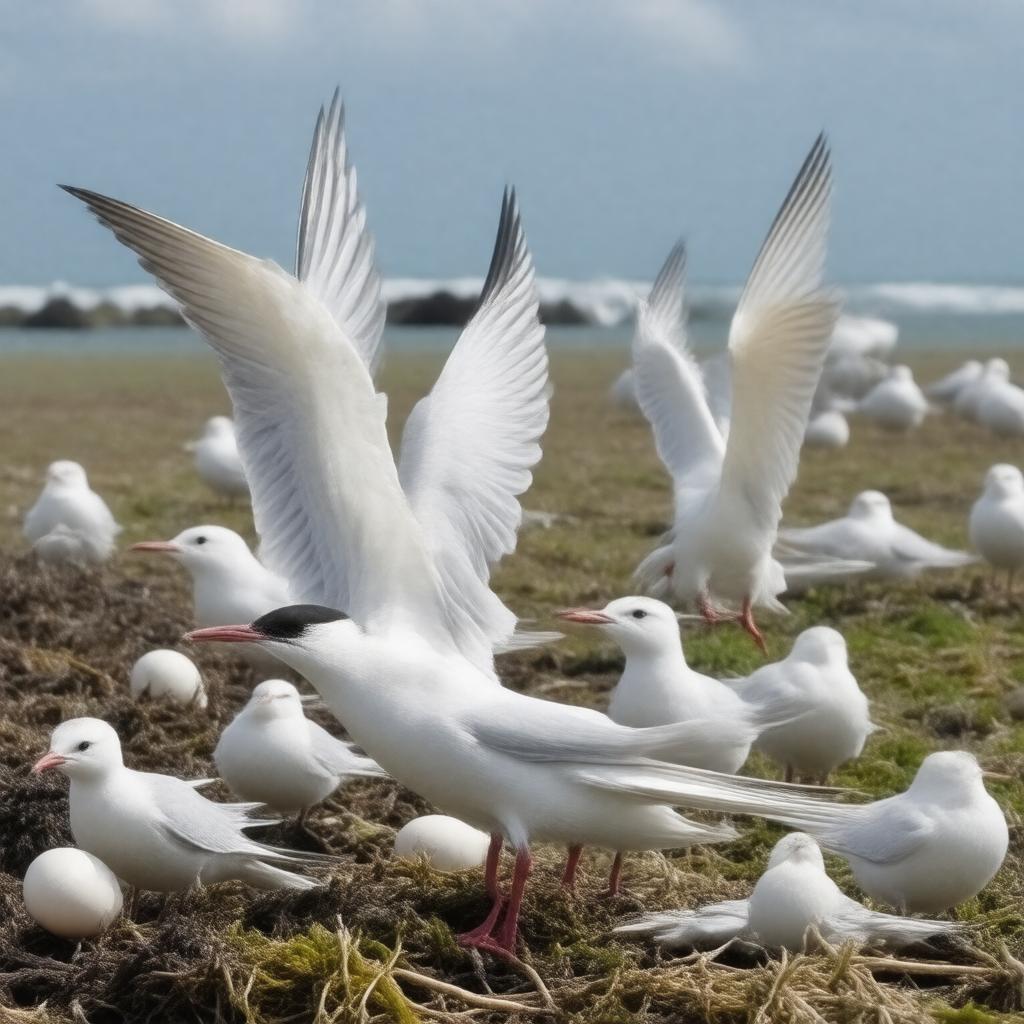 "Generate an image of a group of typical terns (Sterna genus) in their coastal habitat, with a few individuals flying and others standing or sitting on the ground, possibly with eggs nearby, showcasing their slender bodies, long wings, and distinctive calls, in a realistic and naturalistic style."