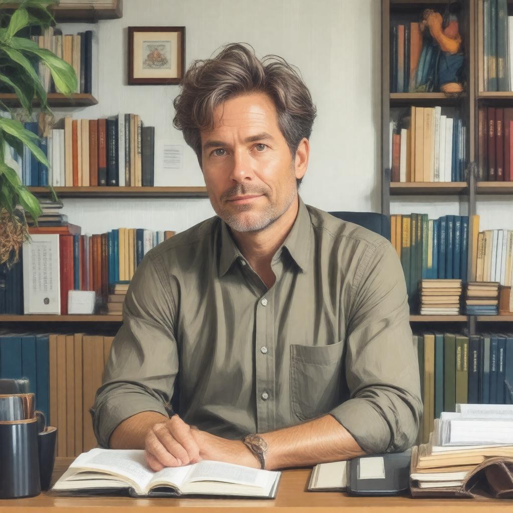 Create a realistic portrait of Steven Johnson, a middle-aged American author and media theorist, sitting in a modern study surrounded by books and technology, with a thoughtful expression, wearing a casual yet professional outfit, in a style that blends traditional and digital media, with a color palette that reflects his affinity for innovation and creativity.