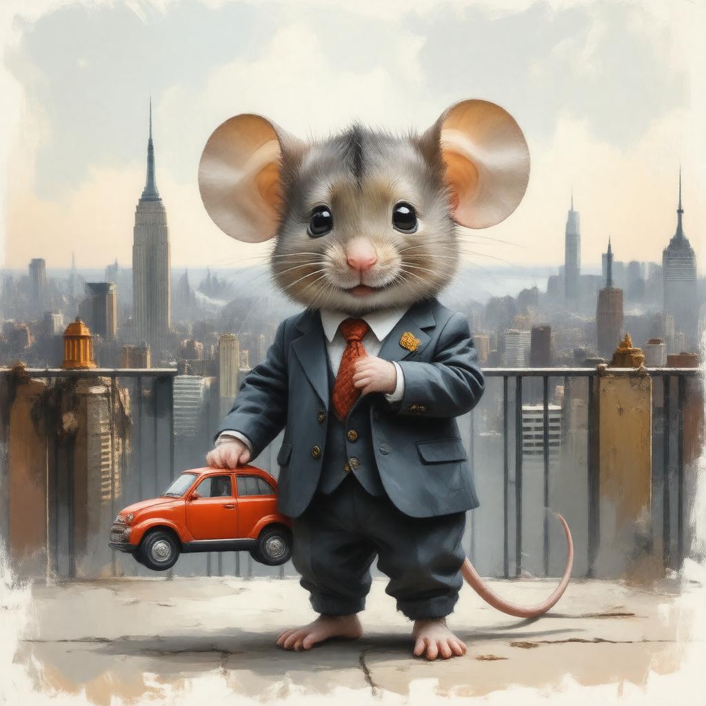 Generate an image of a small, anthropomorphic mouse wearing a suit and holding a toy car, standing in front of a New York City skyline, with a friendly expression on his face, in a whimsical and family-friendly illustration style reminiscent of the 1999 film adaptation, with vibrant colors and textures that evoke a sense of wonder and adventure.