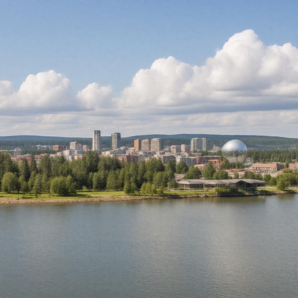 "Generate a realistic image of the city of Greater Sudbury, Ontario, Canada, showcasing its vibrant downtown area, possibly with the Big Nickel landmark in the foreground and the city's scenic lake and forest surroundings in the background, under a bright and sunny day with a few puffy clouds, in a style that reflects the city's rich history and natural beauty."