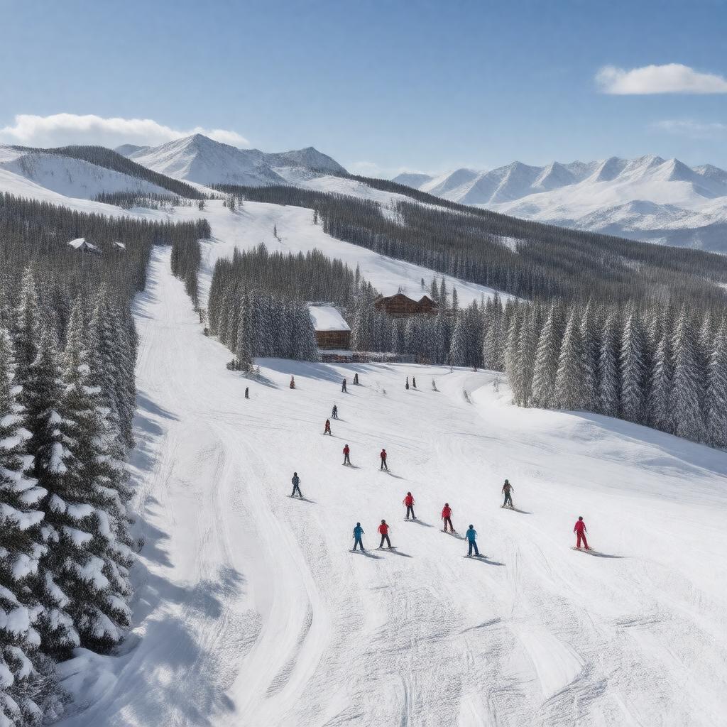 "Generate an image of a serene winter wonderland scene at Sugar Bowl Resort, a prominent ski resort located in Norden, California, with snow-capped peaks, lush trees, and skiers gliding down the slopes, showcasing its 1650 acres of skiable area, 103 trails, and 12 lifts, with the Sugar Bowl Lodge and surrounding mountains in the background, under a clear blue sky with a few wispy clouds, in a realistic and inviting style."