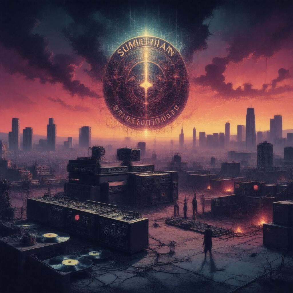 "Generate an image of the Sumerian Records logo or headquarters in a dark, edgy, and modern style, surrounded by elements that reflect the metalcore, progressive metal, deathcore, and alternative rock genres, such as musical instruments, vinyl records, or abstract patterns, set against a Los Angeles cityscape at dusk, with a bold and intense color scheme."