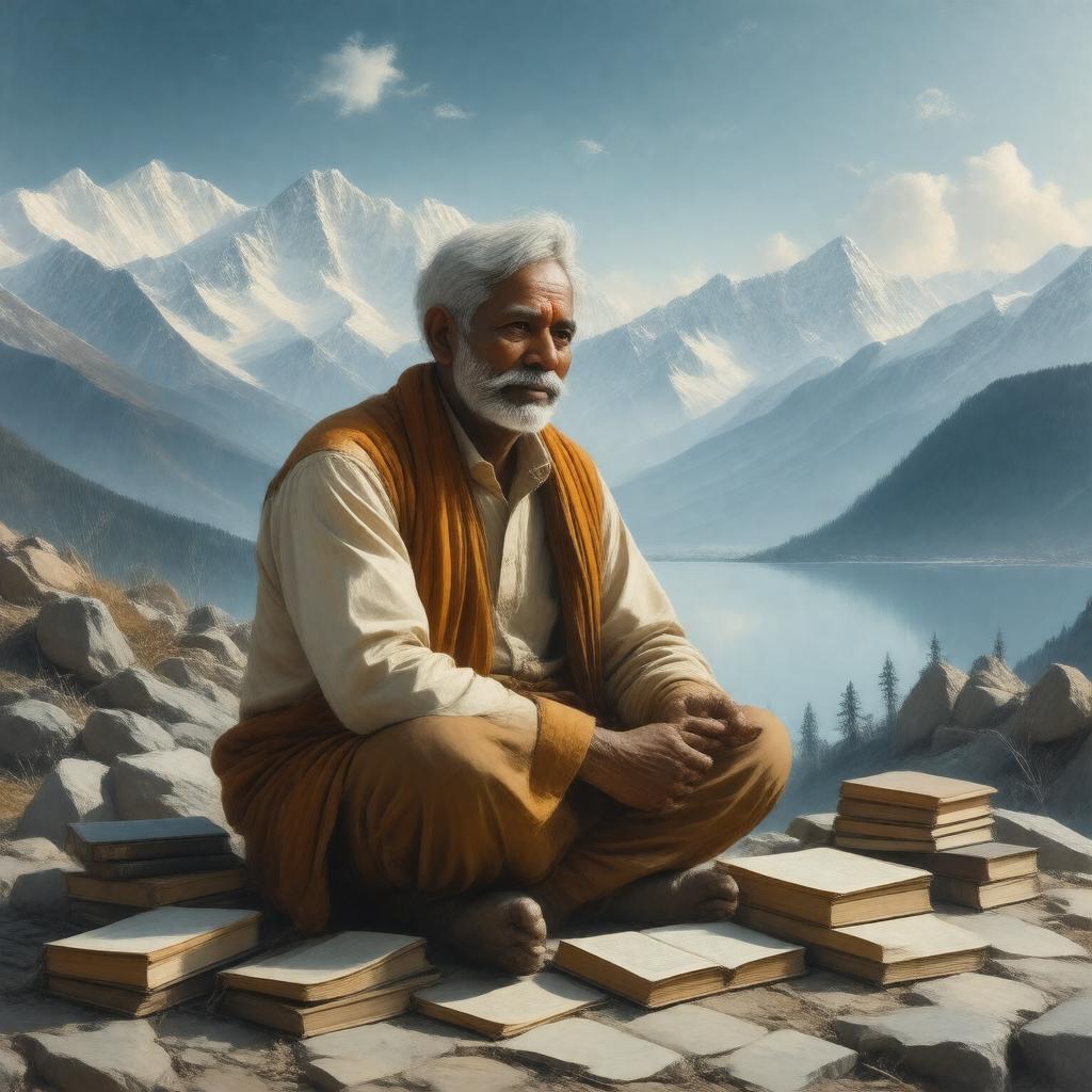 Create a realistic portrait of Sumitranandan Pant, an Indian poet and writer, sitting amidst a serene Himalayan backdrop, reflecting on his literary works, with a warm and gentle expression, dressed in traditional Indian attire, surrounded by books and papers, in a style that echoes the simplicity and elegance of his poetry, reminiscent of the Chhayavaad movement, with soft, muted colors and gentle lighting.