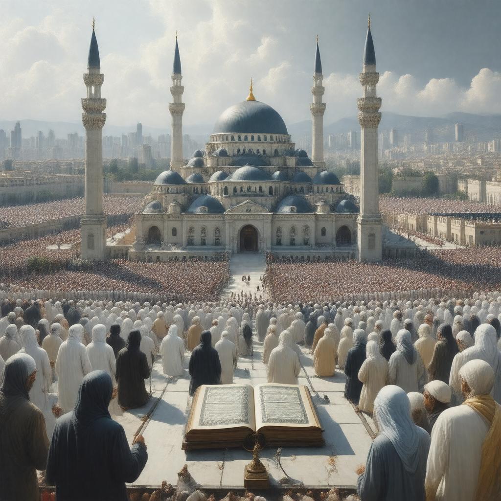 "Generate an image of a mosque with a large crowd of people praying, set against a backdrop of a cityscape with minarets and domes, symbolizing Sunni Islam, with a subtle Quran or Hadith in the foreground, in a realistic and serene style."