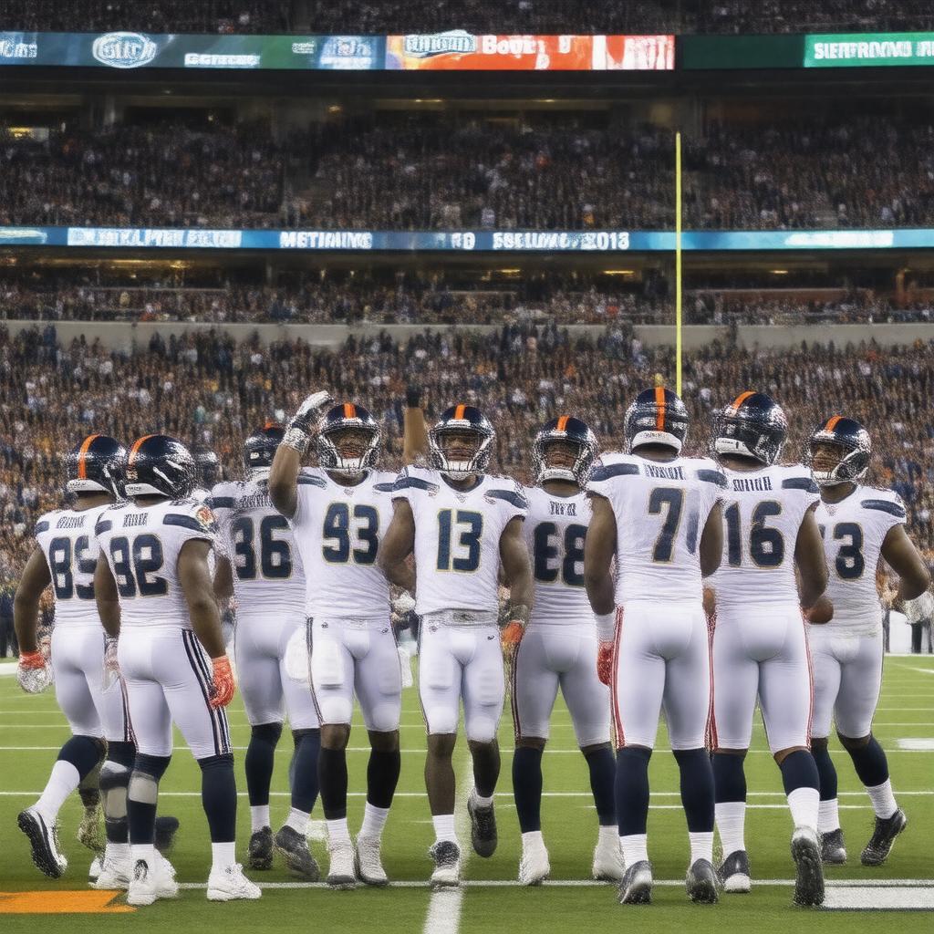 "Generate an image of Super Bowl XLVIII, depicting the Seattle Seahawks celebrating their 43-8 victory over the Denver Broncos at MetLife Stadium in East Rutherford, New Jersey, on February 2, 2014, with a packed stadium and a scoreboard showing the final score, in a realistic sports photography style."