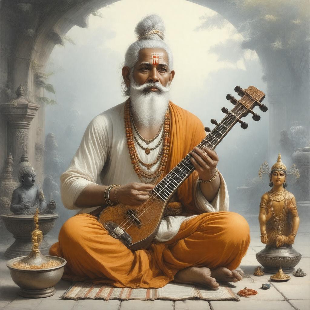 Generate an image of a 15th or 16th-century Indian poet, specifically a blind Hindu saint, dressed in traditional attire, sitting in a serene environment, surrounded by symbols of devotion to Krishna, with a poetic manuscript or a musical instrument, such as a veena, nearby, in a style that reflects the Vaishnavism tradition and Braj Bhasha literature, reminiscent of the Braj region in India.