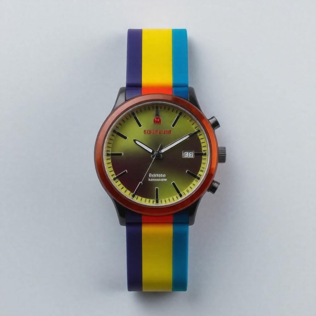 "Generate an image of a vibrant and colorful Swatch wristwatch, prominently displaying the brand's iconic logo, set against a sleek and modern background that reflects the company's Swiss heritage and reputation for affordable, stylish timepieces, in a realistic and detailed style."