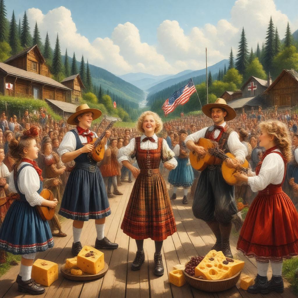 "Create an image of a vibrant Swiss American community celebration, with people of various ages dressed in traditional Swiss attire, surrounded by iconic American and Swiss symbols, such as the American flag, Swiss flags, and chalets. Incorporate elements reflecting their cultural heritage, like cheese, chocolate, and fondue, alongside American and Swiss folk music and dance. In the background, include subtle hints of major Swiss American settlement areas, such as Wisconsin's countryside or Ohio's cityscape. The style should be colorful, lively, and reminiscent of a festive atmosphere, highlighting the rich cultural blend of Swiss and American traditions."