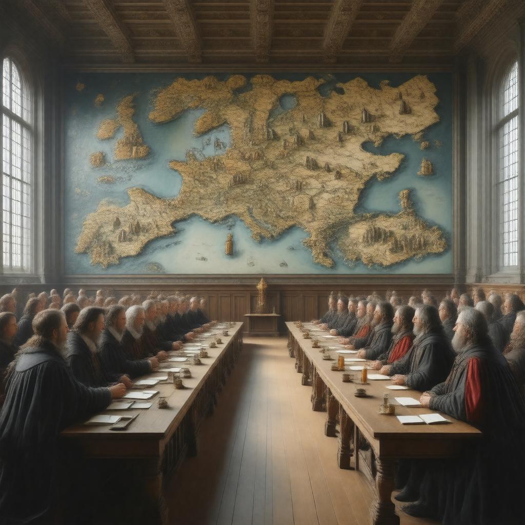 "Generate an image of a 17th-century synod meeting in a grand hall, with Reformed theologians seated around a long table, engaged in intense discussion and debate, set against the backdrop of a large map of the Netherlands, specifically Dordrecht, with a mix of ornate wooden furniture and traditional Dutch architectural elements, in a formal, realistic style, representing the Synod of Dort, a pivotal historical event in the Dutch Reformed Church."