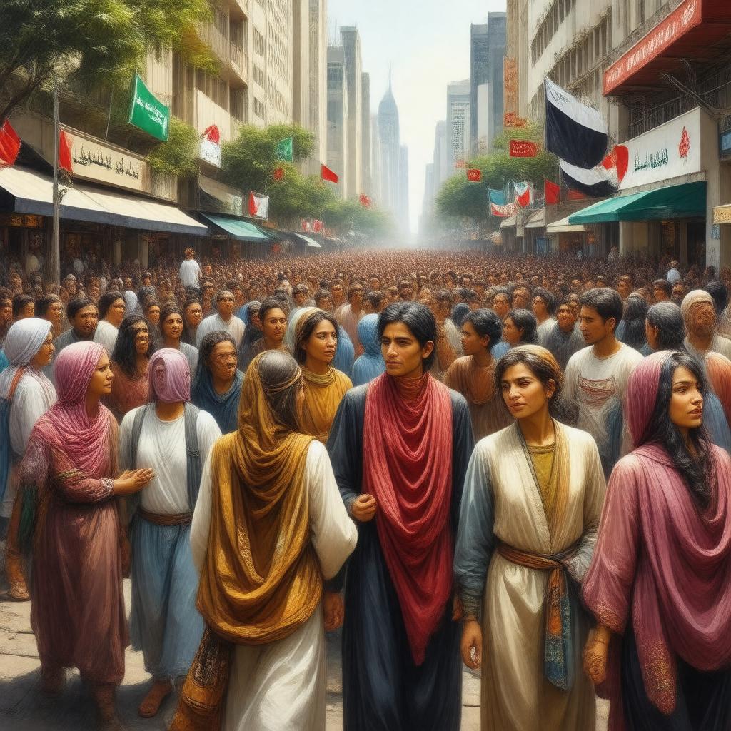 "Create an image of a vibrant and diverse community gathering, representing Syrian Americans. The scene should be set in a cityscape with a mix of modern and traditional architecture, possibly in New York City, Los Angeles, Detroit, or Miami. Include people of various ages, dressed in casual, everyday attire, with some wearing traditional Syrian clothing. Incorporate elements that reflect the rich cultural heritage of Syrian Americans, such as Arabic and English signs, Syrian flags, and traditional food, music, and art. In the background, include subtle hints of the different religions practiced by Syrian Americans, such as a church, mosque, or synagogue. The overall atmosphere should convey a sense of community, resilience, and cultural pride. Style: colorful, lively, and realistic."