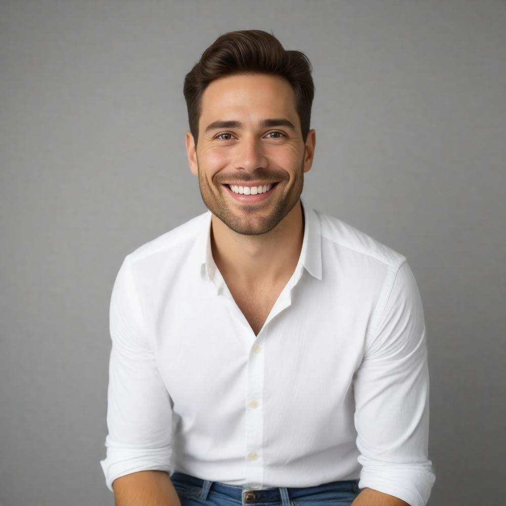 Generate a realistic image of a smiling man in his mid-30s, with short brown hair and a friendly demeanor, wearing a casual white shirt and jeans, representing the given name "Tom".